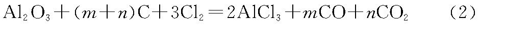 氧化鋁法是以氧化鋁、氯氣及碳三者為原料共同反應制取無水三氯化鋁。國外研究者20世紀60年代后期曾對氧化鋁法制無水三氯化鋁的反應機理進行了研究, 他們認為氧化鋁法制無水三氯化鋁的反應式為: